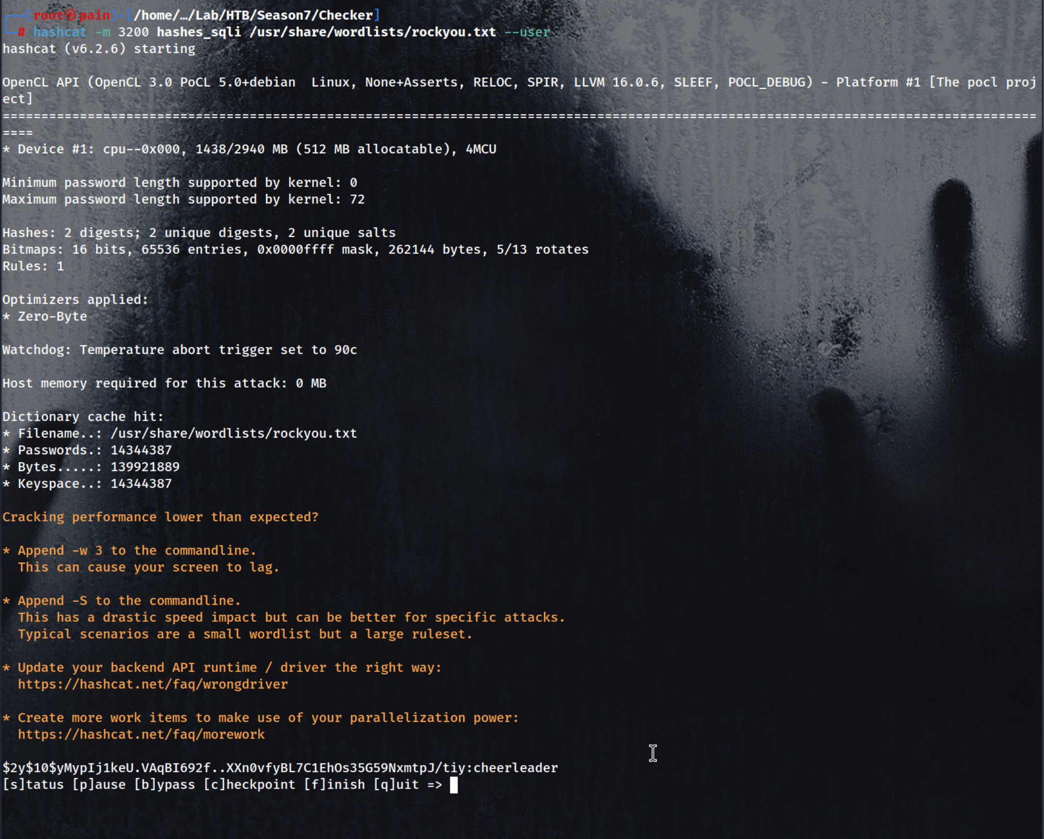 hashcat -m 3200 hashes_sqli /usr/share/wordlists/rockyou.txt --user