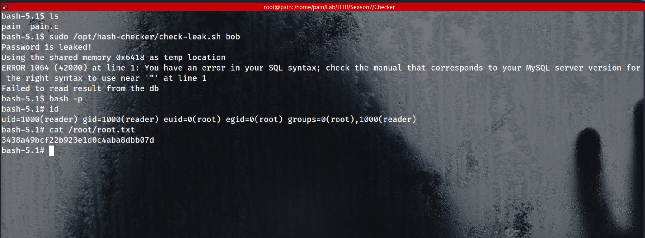 Finally, we can exploit the vulnerable binary by running the check-leak.sh script as a sudo user in a separate shell.